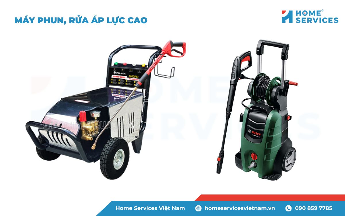 Máy phun rửa áp lực cao | Sử dụng tia nước áp lực cực mạnh để đánh bay bùn đất, rong rêu, dầu mỡ, lớp sơn cũ. | Vệ sinh sân bãi ngoài trời, tường rào, sàn nhà xưởng dính dầu mỡ nặng, gầm xe tải, máy móc xây dựng. | |
